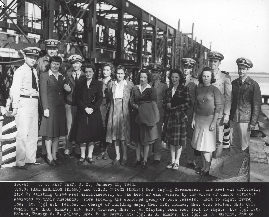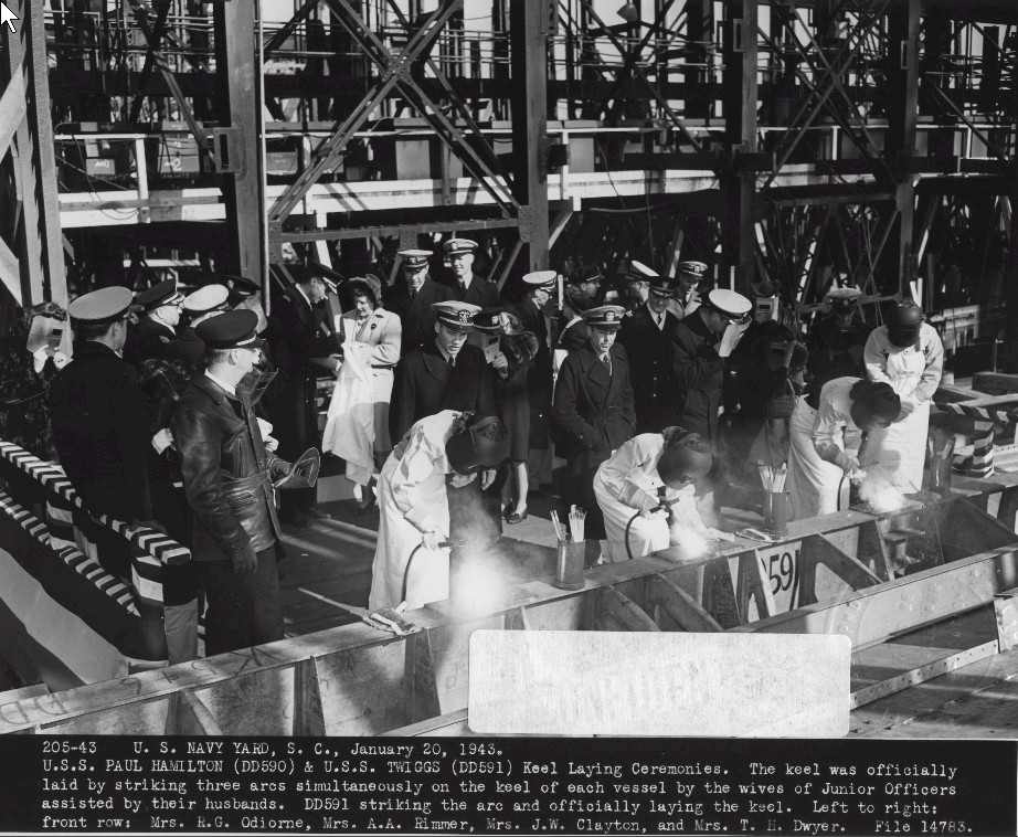 205k | Charleston Navy Yard, 20 January 1943. Keel laying ceremonies for USS Paul Hamilton (DD-590) and USS Twiggs (DD-591). The keel was officially laid by striking three arcs simutaneously on the keel of each vessel by the wives of junior officers, assisted by their husbands. View showing the combined group of both vessesls. | Mike Mohl | |