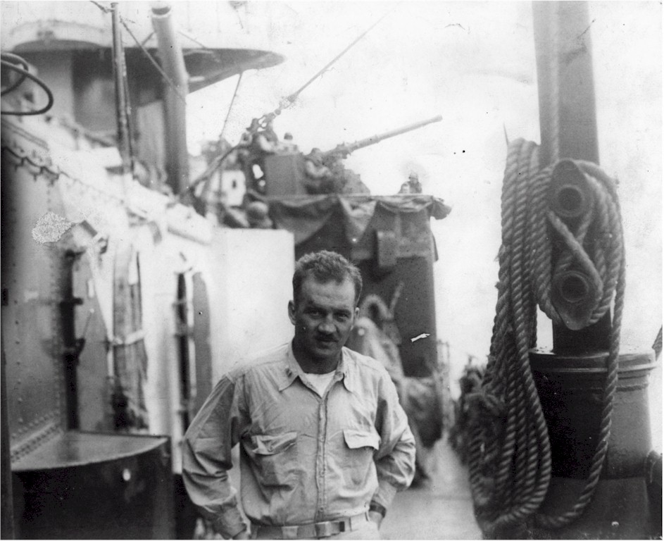145k | Lieutenant Abe Forsythe, Jr., pictured on the deck of USS Twiggs (DD-591). Forsythe, a pilot with VC-76 off USS Petrof Bay (CVE 80) was picked up by Twiggs after ditching his FM-2 Wildcat during the Battle of Leyte Gulf, 25 October 1944. Photo courtesy of the National Naval Aviation Museum | Bill Gonyo | |