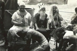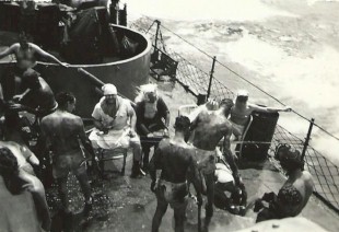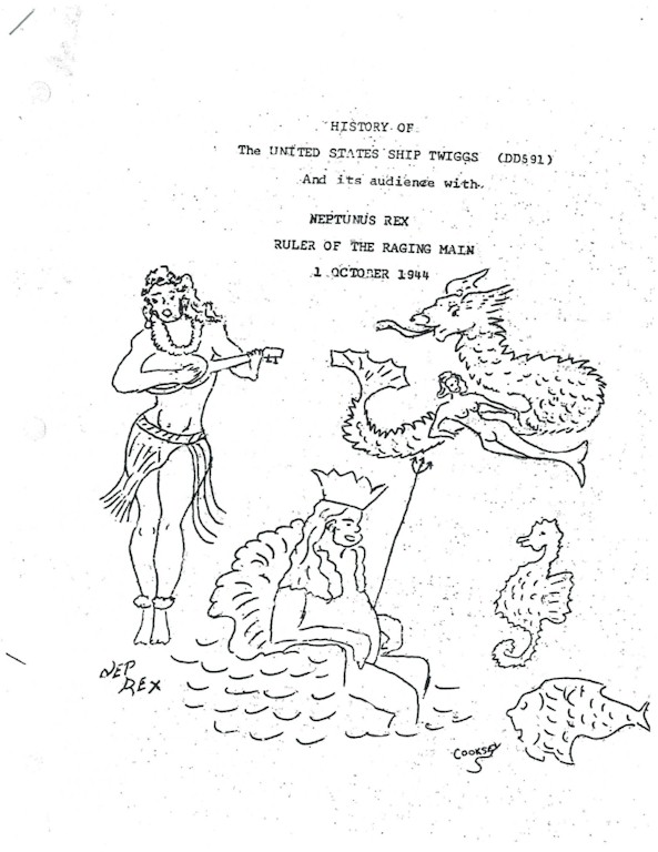 ![]() Crossing the Line ceremonies aboard USS Twiggs (DD-591), 01 October 1944. This ceremony took place while Twiggs was enroute to Manus, Admiralty Islands, with Task Group 33.2. The artwork on the pamphlet cover was done by Billy Cooksey, Water Tender Third Class. The second image is of the initiation ceremony in progress, As pictured left to right are the following Shellbacks: The Royal Baby, Chief Radioman Warner Chaney (KIA); King Neptune, Chief Commissary Steward, Axel Thorell (Transferred); Royal Queen, Lt. George Stransky, Damage Control Officer(KIA). The third picture is also of the Shellbacks initiating the Pollywogs. | Anonymous donor in memory of Twiggs and her crew | |||