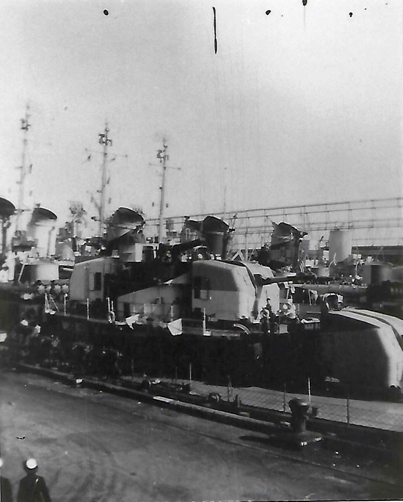 134k | USS Twiggs (DD-591) alongside the repair ship USS Nestor (ARB-6), in the Kerama Retto "boneyard", May 1945. Tarpaulins conceal damage sustained from the Kamikaze hit on 28 April 1945, while on Radar Picket Station #2, north of Okinawa. 10 men were killed and 15 wounded. A steel plate was welded over the damaged area, and Twiggs returned to the fight. This photo was retrieved from Commander George Philip's wallet, which washed ashore when Twiggs was sunk 16 June 1945, southwest of Naha, and was returned to his family. | Anonymous donor in memory of Twiggs and her crew | |