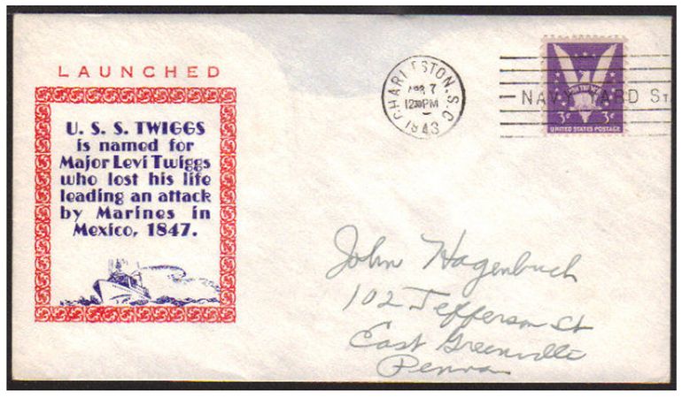 64k | USS Twiggs (DD-591) commemorative envelope postmarked 07 April 1943, the date the destroyer was launched at the Charleston Navy Yard. | Anonymous donor in memory of Twiggs and her crew | |