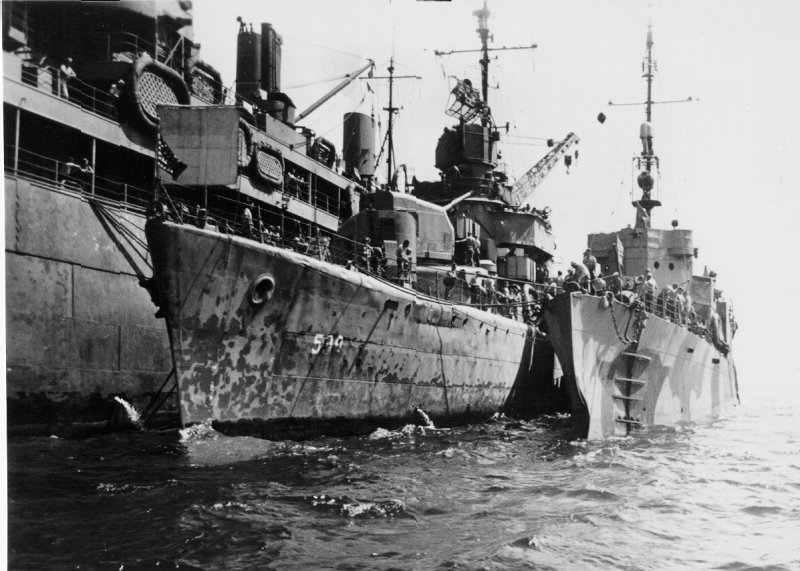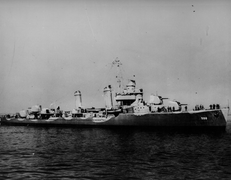 | 74k | USS Harris (APA-2), background. In the foreground is the USS Bancroft (DD-598) underway as part of the screen off Kiska on D-day. Photo taken from "US Destroyer Operations In World War II" by Theodore Roscoe. | Robert Hurst | |