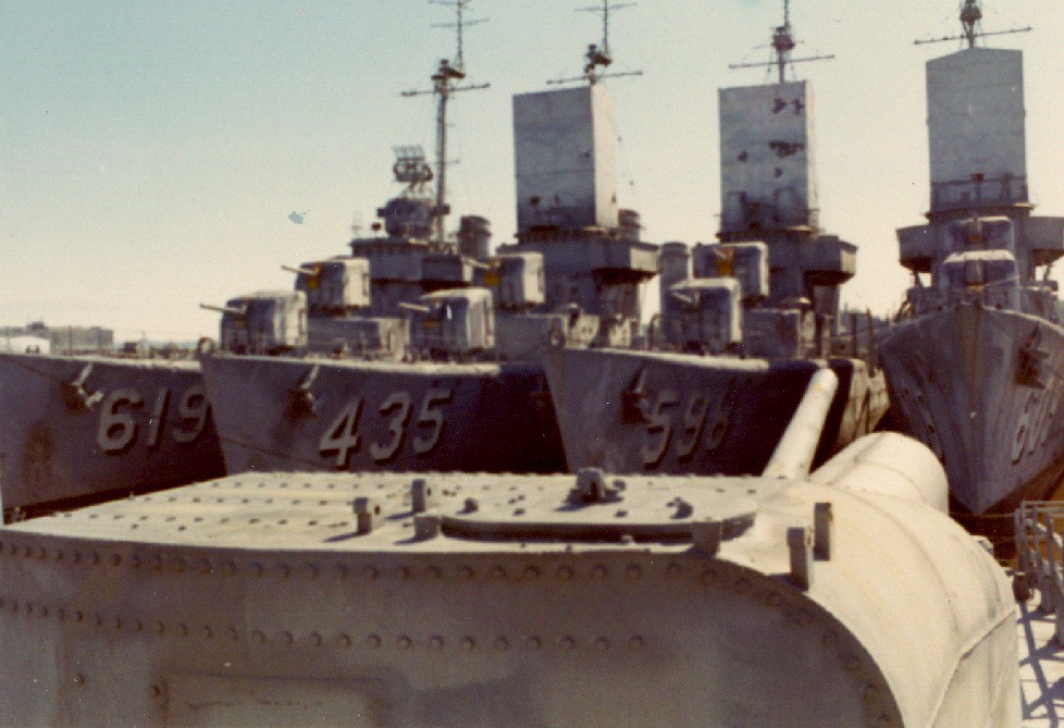 | 168k | Right-to-left are USS Gillespie (DD-609), USS Bancroft (DD-598), USS Grayson (DD-435), and USS Edwards (DD-619) as seen in a 1970 nest at the Orange, Texas Inactive Ship Facility. These are incidental views to a series of photos of USS Hobby's first reunion, with the uncommon chance of all four wearing the larger bow numerals. Photos are by Joe Buya, courtesy Ray and Betty Simons. | John Chiquoine | |