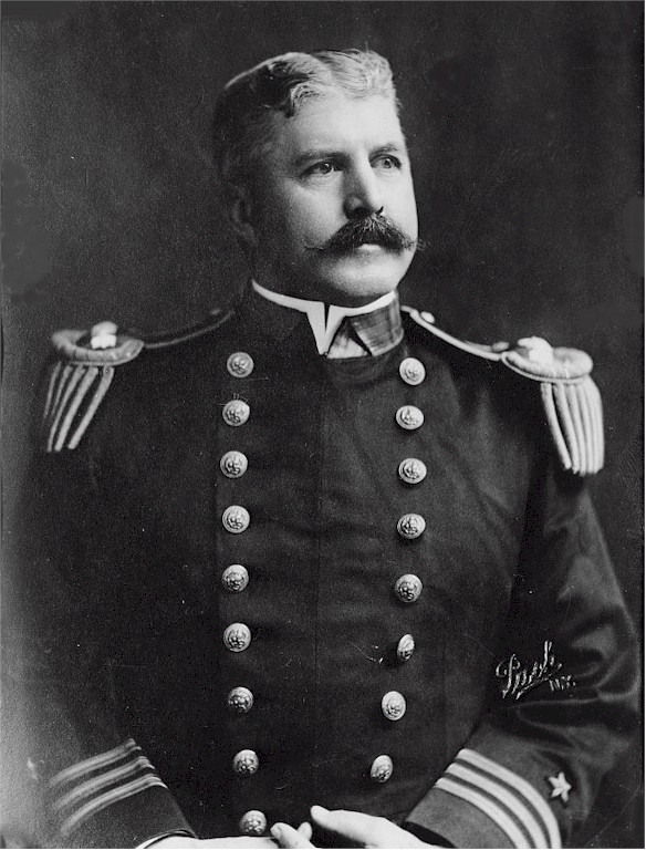 | 131k | John Hood was born in Florence, Ala., 3 December 1859. He was appointed to the Naval Academy in 1875, and graduated from the Naval Academy, second in his class. His first cruise after graduation took him to the South Atlantic in Shenandoah, and he later sailed in Wachusetts, Brooklyn, Vandalia, Mohician, Jamestown, Constellation, Bancroft and Kearsarge. Hood was wrecked with Kearsarge 21 February 1894 on Roncador Reef off Central America in the Pacific, and was a lieutenant in Maine when she was blown up at Havana 15 February 1898. Hood commanded Hawk during the Spanish American War, carried information of the arrival of the Spanish Squadron off Santiago to the commander of the Flying Squadron at' Cienfuegos, and delivered orders for him to proceed to Santiago 23 May 1898. He also served in Nero during the Spanish War. Hood surveyed the Pacific in 1899-1900 to prepare data and charts by which the Pacific cable was laid. He commanded Elcano in Chinese waters during the Russo-Japanese War from 1903 to 1905 and Tacoma from 1907 to 1909, during Haitian and Central American revolutions and elections. He was in charge of the ships at the Naval Academy in 1909 and 1910. He commanded Rhode Island of the Atlantic Fleet in 1910-11. Under him in 1911-12, Delaware won the battle efficiency pennant. From 1912 to 1915 he was a member of the General Board of the Navy. In 1915-16 he commanded Texas which won the "Red E" for excellence in engineering efficiency. He was promoted to Rear Admiral August 29, 1916 and retired 18 March 1918. Admiral Hood died at the Naval Hospital, Annapolis, Md., February 11, 1919. Digital ID: ggbain 15824, Library of Congress Prints and Photographs Division. | Bill Gonyo |