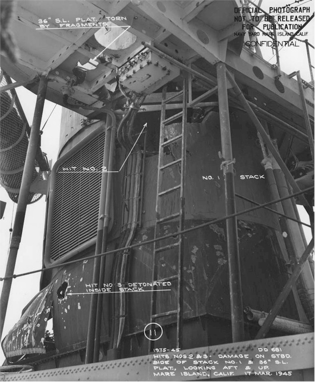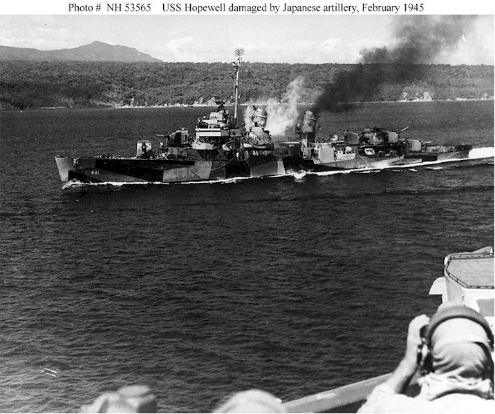 | 137k | Photo #: NH 44906. USS Hopewell (DD-681) damage from a Japanese shore battery shell that hit the ship amidships while she was supporting minesweeping operations off Corregidor, in Manila Bay, Philippines, 14 February 1945. Official U.S. Navy Photograph, from the collections of the Naval Historical Center. | Tony Cowart | |