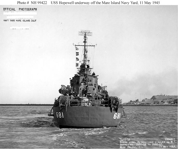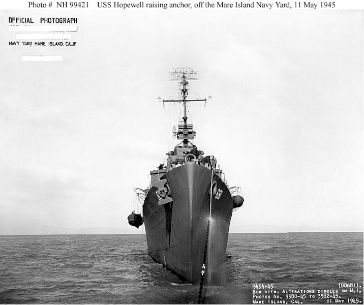 | 101k | Photo #: NH 99422. USS Hopewell (DD-681) underway off the Mare Island Navy Yard, California, 11 May 1945. Official U.S. Navy Photograph, from the collections of the Naval Historical Center. | Tony Cowart | |