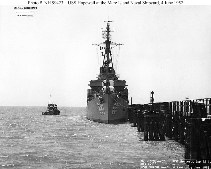 | 79k | Photo #: NH 99423. USS Hopewell (DD-681) at the Mare Island Naval Shipyard, California, 4 June 1952. Official U.S. Navy Photograph, from the collections of the Naval Historical Center. | Tony Cowart | |