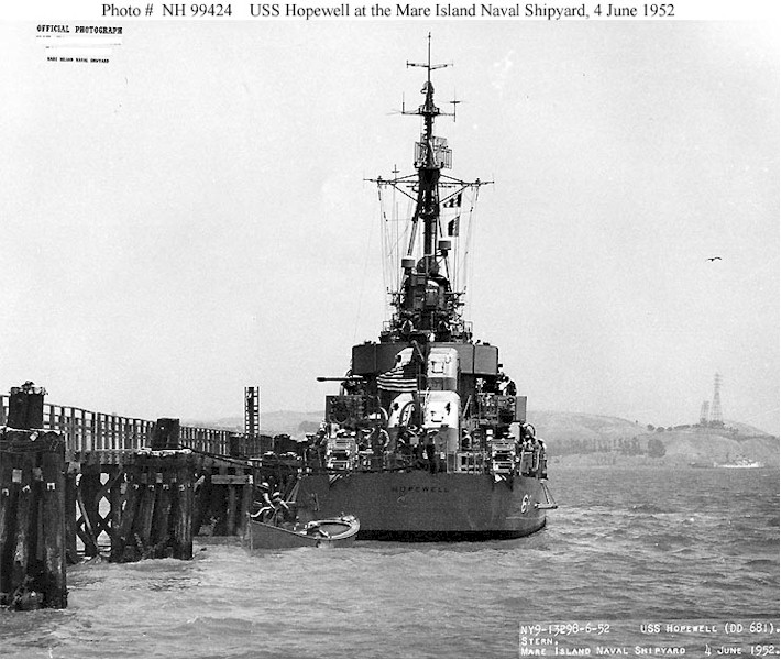 | 120k | Photo #: NH 99424. USS Hopewell (DD-681) at the Mare Island Naval Shipyard, California, 4 June 1952. Note the 26-foot motor whaleboat maneuvering off the ship's stern. Official U.S. Navy Photograph, from the collections of the Naval Historical Center. | Tony Cowart | |
