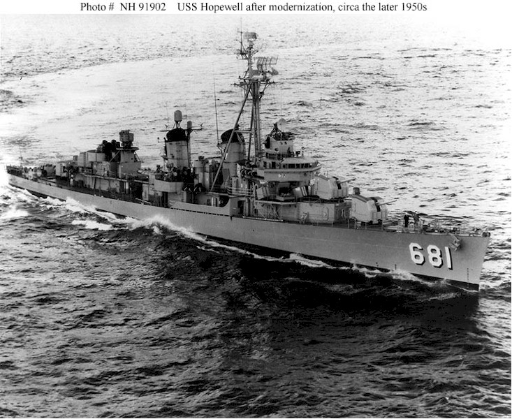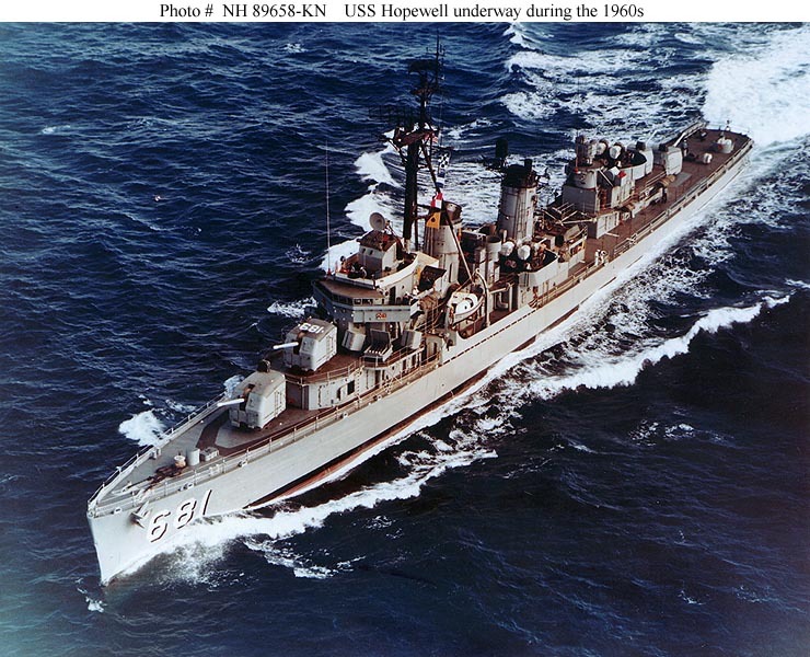| 148k | Photo #: NH 89658-KN. USS Hopewell (DD-681) underway during the 1960s. U.S. Naval Historical Center Photograph. | Tony Cowart | |