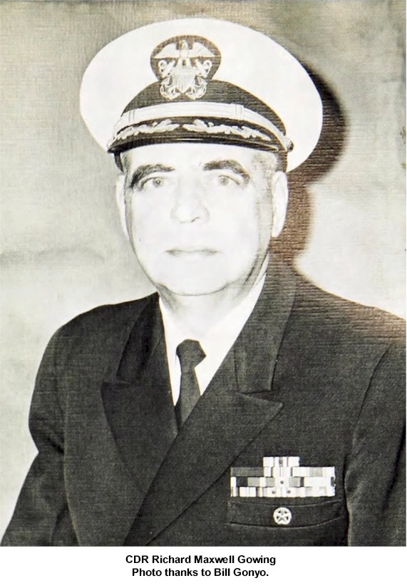 CDR Howard Wright Gordon Jr. Mar 10 1944 - Nov 23 1944 CDR John Frank Harper Jr. Nov 23 1944 - Nov 1945 (Later RADM) CDR Fenelon Aveilhe Brock Nov 1945 - Aug 1947 CDR Anthony Telerico Aug 1947 - Jan 1948 CDR Herman Hart Kait Jan 1948 - Jul 31 1950 CDR Herbert Arthur Cassidy Jr. Jul 31 1950 - Jul 1952 CDR Ovid McMaster Butler Jul 1952 - 1953 CDR Otis Clarence Ferrell Jr. 1953 - 1954 CDR James Herbert Spalding Jr. 1954 - 1956 CDR John London Holmes Jr. 1956 - 1957 CDR Charles Clay Roberts Jr. 1957 - 1959 CDR John Sampson Donaldson 1960 - May 1962 CDR John Michael Ferrante May 1962 - 1964 CDR Charles Edmund (Ted) Faas 1964 - 1965 CDR Stanley Sidney Fine 1965 - Oct 1967 (Later RADM) CDR Richard Maxwell Gowing Oct 1967 - Oct 1969 CDR James Thomas Simms Oct 1969 - Jun 15 1971