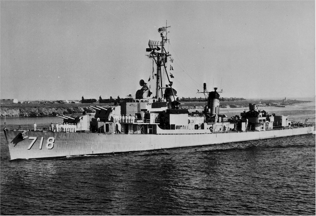 | 205k | This photo was originally published in the November 1960 issue of CruDesPac News. The four ships were manning the rail to salute President Eisenhower as he passed by in his barge. The President is standing topside in the barge, midships. The other ships in the picture are USS Wiltsie (DD 716), USS Morton (DD948), and USS De Haven (DD727). We were moored in San Diego Bay. | Al Creasy, ENS USS Morton | |