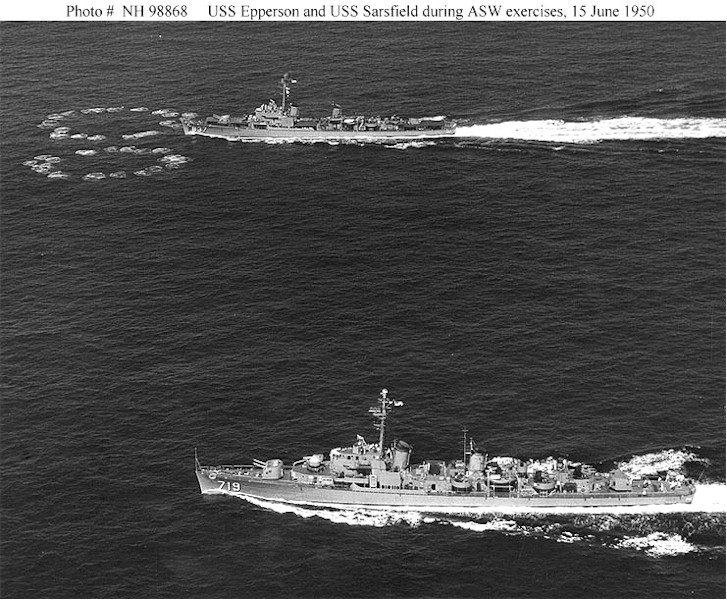 | 148k | USS Epperson (DDE-719), in the foreground and USS Sarsfield (DD-837) Taking part in anti-submarine warfare exercises, 15 June 1950. Sarsfield has fired a dual Hedgehoge pattern, and is over-running the impact area. Note that she carries only one twin 5"/38 gun mount forward. Official U.S. Navy Photograph, from the collections of the Naval Historical Center. | Fred Weiss |