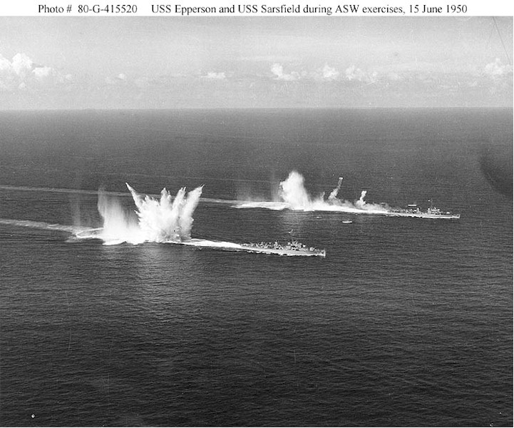 | 121k | USS Epperson (DDE-719), center and USS Sarsfield (DD-837), at right Dropping depth charges during anti-submarine warfare exercises, 15 June 1950. Sarsfield has also fired her "K-Gun" depth charge projectors, making vertical smoke trails (aft of the ship) and impact splashes to port and starboard. Official U.S. Navy Photograph, now in the collections of the National Archives. | Fred Weiss |