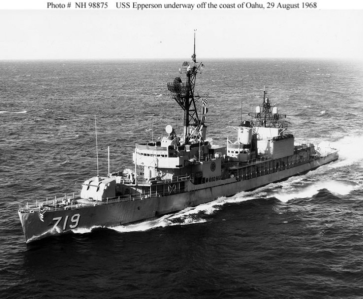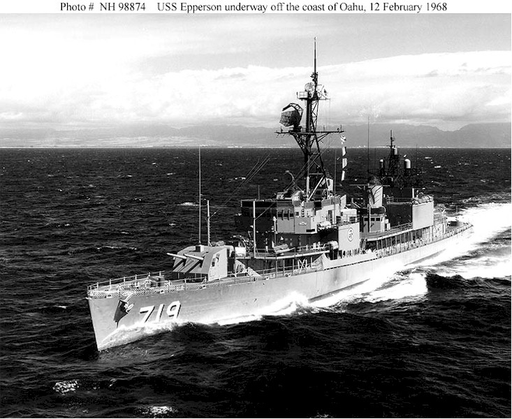 | 141k | USS Epperson (DD-719) Underway off the coast of Oahu, Hawaii, 12 February 1968. Photographed by PHCM/AC Louis P. Bodine. Official U.S. Navy Photograph, from the collections of the Naval Historical Center. | Fred Weiss |
