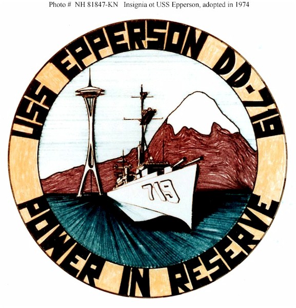 | 102k | USS Epperson (DD-719) Emblem adopted in 1974. Its design alludes to her duty as Naval Reserve Training ship at Seattle, Washington. U.S. Naval Historical Center Photograph. | Fred Weiss |