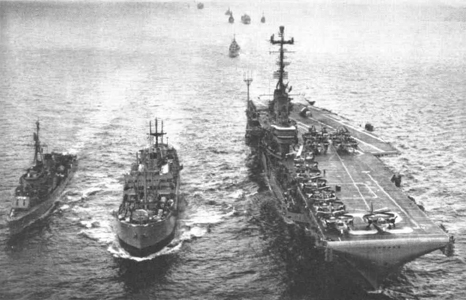 | 177k | The Royal Fleet Auxiliary RFA Fort Dunvegan (A160) replenishes the aircraft carrier USS Bennington (CVS-20) and the destroyer USS Epperson (DD-719) during the SEATO ASW exercise "Sea Devil" in the Coral Sea, in 1962. The Bennington, with assigned Carrier Anti-submarine Air Group 59 (CVSG-59), was deployed to the Western Pacific from 7 January to 25 July 1962. Photo from U.S. Navy Aviation News [1] July 1962, p. 14. | Robert Hurst |