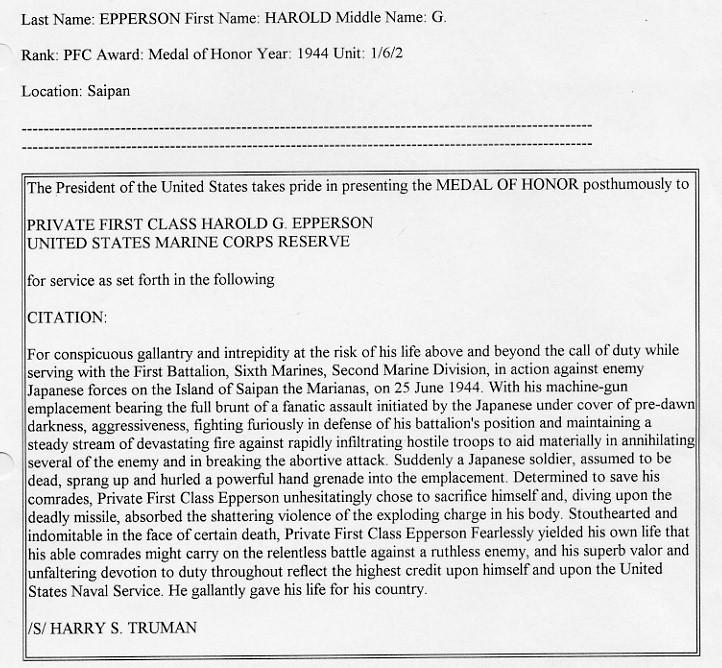174k | Harold Glenn Epperson, born 14 July 1923 in Akron, Ohio, enlisted in the U.S. Marine Corps Reserve 12 December 1942. Private Epperson served with distinction in the assaults on Tarawa and Saipan, sharing in the Presidential Unit Citation awarded his organization for its service at Tarawa. He was killed in action on Saipan 25 June 1944, and received the Medal of Honor posthumously for his great courage and self-sacrifice in throwing himself on an enemy hand grenade to save his comrades from the effect of its explosion. Photo from the USMC History Division. | Bill Gonyo/Dan Ninedorf |