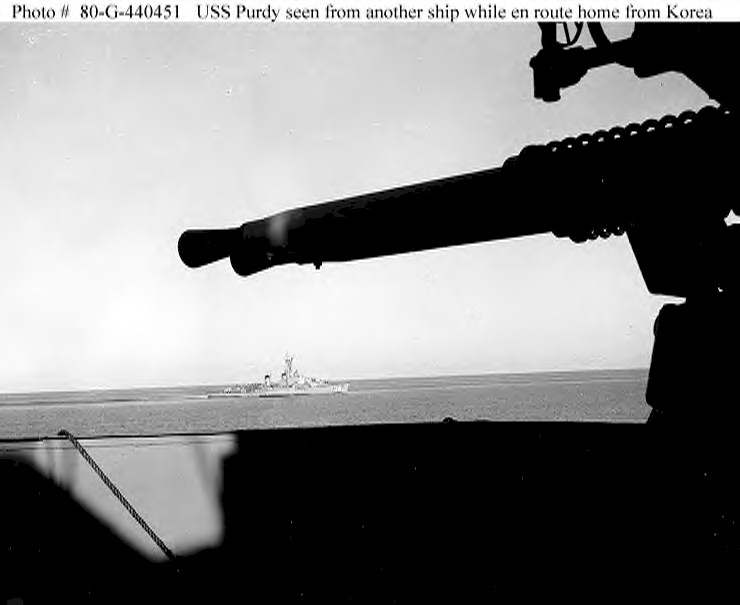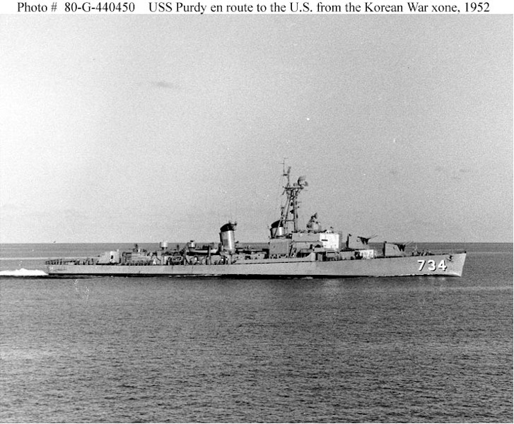 | 129k | Photo #: 80-G-440450: USS Purdy (DD-734) en route to the the United States with Destroyer Division 122, following Korean War combat duty, circa 27 February - 21 March 1952. Photo was received by the Naval Photographic Center in March 1952. Official U.S. Navy Photograph, now in the collections of the National Archives. | Scott Dyben | |