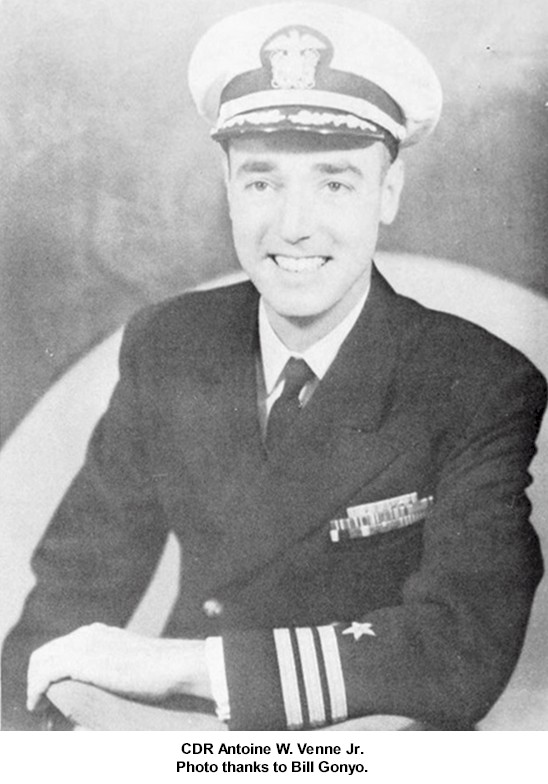 CDR Frank Lesher Johnson Jul 18 1944 - Jul 24 1945 CDR Wilson Gartley Reifenrath Jul 24 1945 - Nov 1 1947 CDR Arthur Jenkins Barrett Jr. Nov 1 1947 - Nov 21 1949 CDR James Henry Ashley Jr. Nov 21 1949 - Sep 30 1951 (Later RADM) CDR James Pagaud Coleman Sep 30 1951 - Jun 15 1953 CDR James Frederick Phelan Jun 15 1953 - Mar 25 1955 CDR William Earl Simmons Mar 25 1955 - Jun 17 1957 CDR Antoine William Venne Jr. Jun 17 1957 - May 23 1959 LCDR Horace Clinton Holley Sr. May 23 1959 - Mar 3 1961 CDR Albert August Steinbeck Mar 3 1961 - Dec 12 1962 CDR David Dyer Ansel Dec 12 1962 - Jul 25 1964 CDR Jack Conway Crandall Jul 25 1964 - Mar 30 1966 CDR Edmund Dix Rogers Jr. Mar 30 1966 - Apr 16 1968 CDR Robert Allen Wheeler Apr 16 1968 - Oct 10 1969 CDR Robert Francis Campion Jr. Oct 10 1969 - Aug 12 1971 CDR John Edward Waslowski Aug 12 1971 - Jul 2 1973
