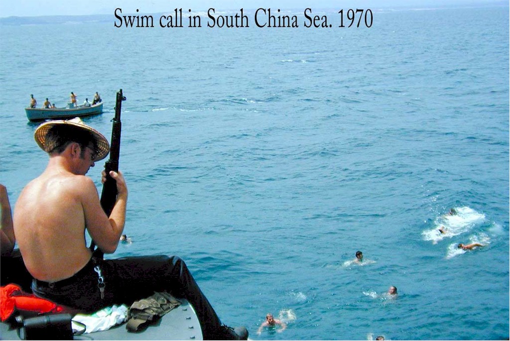 | 178k | Swim call in the South China Sea, 1971. Photo shows 1970 but should be 1971. | Richard Albright |