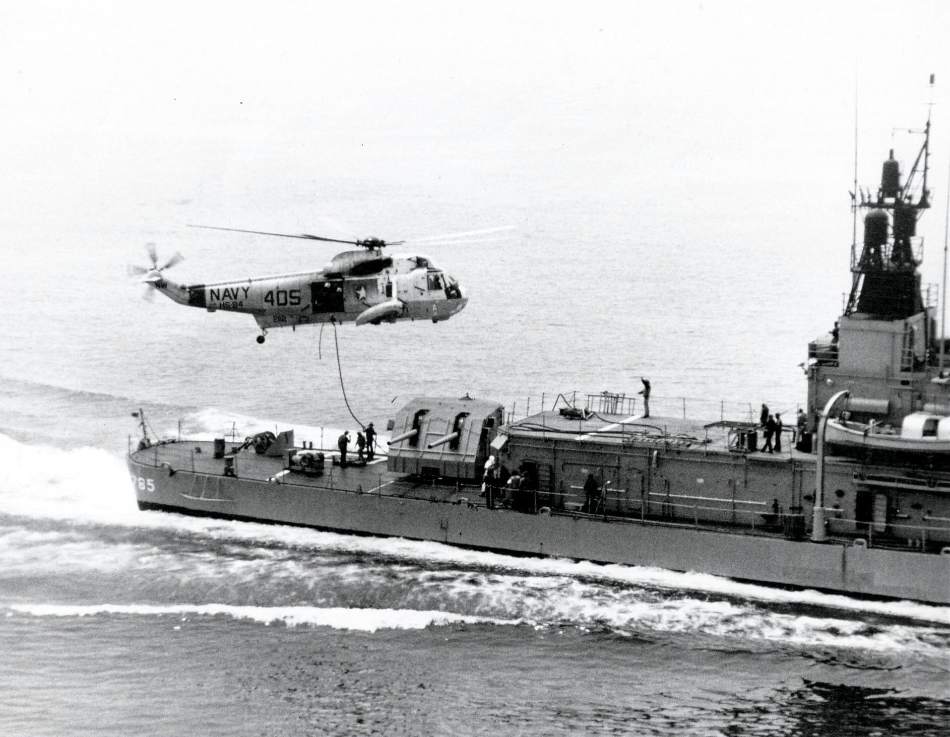 | 346k | An SH-3A Sea King of Helicopter Antisubmarine Squadron (HS) 84 pictured during refueling from the USS Henderson (DD-785) during Pacific Ocean operations on 17 August 1975.