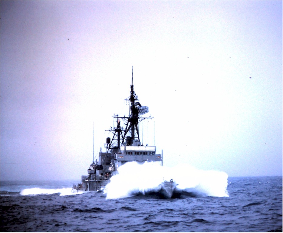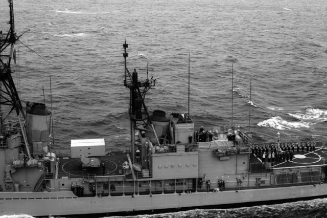 | 132k | Coming alongside the USS England (DLG-22) in heavy weather to highline personnel. Late 1968 during a WestPac deployment. | John Spivey |
