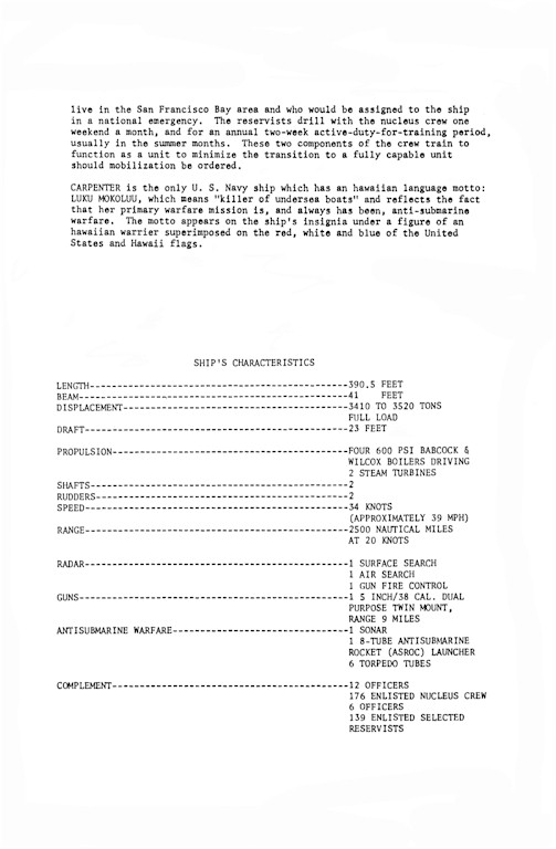 | 23k | Donald Marshall Carpenter, born in Hopbottom, Pennsylvania, on 6 March 1894, attended grade schools in Scranton and high school in McKeesport, and was appointed a midshipman from the 30th District of Pennsylvania on 11 July 1912. Graduating from the U.S. Naval Academy, Annapolis, Maryland, on 2 June 1916, “Doc” Carpenter reported to his first ship, Wyoming (Battleship No. 32) on 17 June. He was commissioned ensign on 5 July 1916. During his World War I service in Wyoming, Carpenter received temporary promotions to lieutenant (junior grade) (3 October 1917) and lieutenant (6 February 1918); permanent promotions to those ranks followed, on 12 March 1920 and 31 March 1921, respectively. Detached from Wyoming on 16 May 1921, Carpenter reported to Mare Island Navy Yard, Vallejo, California, five days later, and over the ensuing months, helped fit out the new battleship California (BB-44). Detached from California on 8 May 1922, Carpenter was slated to join Nevada (BB-36) before her departure for the Atlantic coast, but received authorization to proceed to Pensacola, Florida, via commercial transportation, at his own expense, “for temporary duty under instruction in heavier-than-air craft.” Opting for flight training over continued service in battleships, Carpenter, authorized a month’s delay in transit, reported to NAS Pensacola on 19 June 1922. Upon completion of flight training, Carpenter was detached from NAS Pensacola on 3 April 1923; he also married Clara Moreno the same day (a union that ultimately produced two sons). He reported for duty with Aircraft Squadrons, Battle Fleet, on 27 April 1923, and remained with that aeronautical organization until assigned temporary duty with Aircraft Squadrons, Scouting Fleet; he served with that unit until 20 May 1925. Commissioned lieutenant commander on 5 February 1927 while at Pensacola, Carpenter joined Stoddert (DD-302) on 23 June 1928 upon that destroyer’s return from operations with the Battle Fleet in Hawaiian waters, and served as her executive officer until 20 September 1929. Ordered to Langley (CV-1), he reported for duty the following day, and served in that aircraft carrier until 30 June 1930. Assuming command on 30 June 1930 of Scouting Squadron (VS) 3B, Aircraft Squadrons, Battle Fleet, which operated in the air group assigned to the aircraft carrier Lexington (CV-2), he remained in that billet through his squadron’s being assigned to Carrier Divisions, U.S. Fleet, on 25 October 1930. Leaving VS-3B on 25 April 1931, Carpenter became executive officer of Fleet Air Base (FAB), Coco Solo, Canal Zone, on 26 May 1931, a billet he filled for almost two years, until relieved on 19 July 1933 to assume the post of operations officer for Aircraft Squadrons, Coco Solo. During the late summer of 1933, Carpenter commanded the ferry flight of the first division of Patrol Squadron (VP) 5F from NAS Norfolk, Virginia to FAB Coco Solo. Carpenter flew 5-P-2, one of six Consolidated P2Y-1 flying boats that departed Norfolk mid-way through the first dog watch on 7 September 1933 (accompanied personally during the initial stages of the flight by Rear Admiral Ernest J. King, Chief of the Bureau of Aeronautics, in a Vought SU-1) and reached its destination, a little over halfway through the second dog watch the next day, having covered the 1,788 nautical miles in a total elapsed time of 25 hours and 29 minutes. In the longest non-stop formation seaplane flight in history, the six flying boats battled headwinds for almost the entire aerial voyage, at one point encountering a heavy squall with velocity approaching 50 knots. Detached from FAB Coco Solo on 15 May 1934, Carpenter reported on board seaplane tender Wright (AV-1) three days later, and became her navigator on 30 May 1934. He carried out those duties until hospitalized at the U.S. Naval Hospital, San Diego, California, on 20 November 1934. Released the following spring, he served at NAS San Diego from 11 April to 3 September 1935 before he became Inspector of Naval Aircraft, San Diego, on the latter date. Detached on 10 July 1936 to the Naval Training Station, San Diego, he was relieved of all active duty and placed on the retired list on 1 October 1936. Carpenter died of lobar pneumonia at the U.S. Naval Hospital, San Diego, on 4 April 1940. On 18 June 1945, Mrs. Edward S. Shaw, sister of Carpenter’s widow Clara, wrote to Admiral King, then Commander in Chief, U.S. Fleet (who had commanded Lexington when Carpenter had commanded VS-3B) suggesting that a ship be named for the late leader of VP-5F’s historic flight in 1933, citing the "sincere respect" her brother-in-law had felt for King. "I sincerely hope you will not consider me presumptuous," she wrote, "but if you could lend your approval to such an honor for ‘Doc’ as we all knew him, I would appreciate it very much." "Please do this if you can," King wrote to the Chief of Naval Personnel, who recommended the name assignment on 10 July 1945; consequently, on 14 July 1945, Secretary of the Navy James Forrestal assigned the name Carpenter to DD-825. In writing to Secretary Forrestal upon being informed of the naming of the ship, Carpenter’s widow wrote on 9 August 1945 of her “deep appreciation of the honor bestowed on my two sons and me in the naming of this ship for my late husband and I hope her record will be one of which to be proud..." | Robert M. Cieri/Bill Gonyo/Robert Hurst |