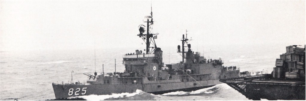 | 81k | USS Carpenter (DDE-825) refueling from the aircraft carrier USS Hornet (CVS-12), in 1962. Hornet, with assigned Carrier Anti-Submarine Air Group 57 (CVSG-57), was deployed to the Western Pacific from 6 June to 21 December 1962. Note the large amount of fuel oil spilled on Carpenter´s decks. U.S. Navy photo from the USS Hornet (CVS-12) 1962 cruise book. | Robert Hurst |