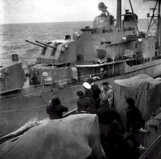 | 95k | USS Hanson (DD-832) as seen from the Australian aircraft carrier HMAS Sydney III, during replenishment at sea, probably in Korean waters sometime between 31 August 1951 to 22 February 1952. Source: Australian War Museum, Photo No. P05890.074. | Mike Green |