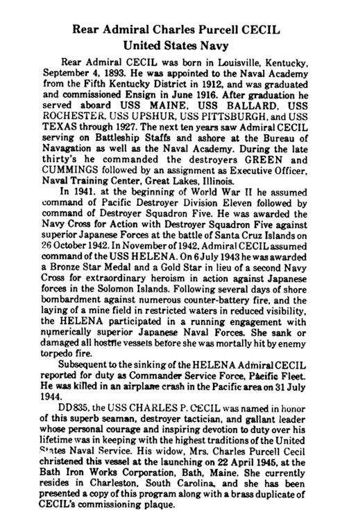 | 36k | Rear Admiral Cecil was born in Louisville, Kentucky, September 4, 1893. He was appointed to the Naval Academy from the Fifth Kentucky District in 1912, and was graduated and commissioned Ensign in June 1916. After graduation he served aboard USS Maine, USS Ballard, USS Rochester, USS Upshur, USS Pittsburg, and USS Texas through 1927. The next ten years saw Admiral Cecil serving on Battleship Staffs and ashore at the Bureau of Navigation as well as the Naval Academy. During the late thirty's he commanded the destroyers Green and Cummings followed by an assignment as Executive Officer, Naval Training Center, Great Lakes, Illinois.