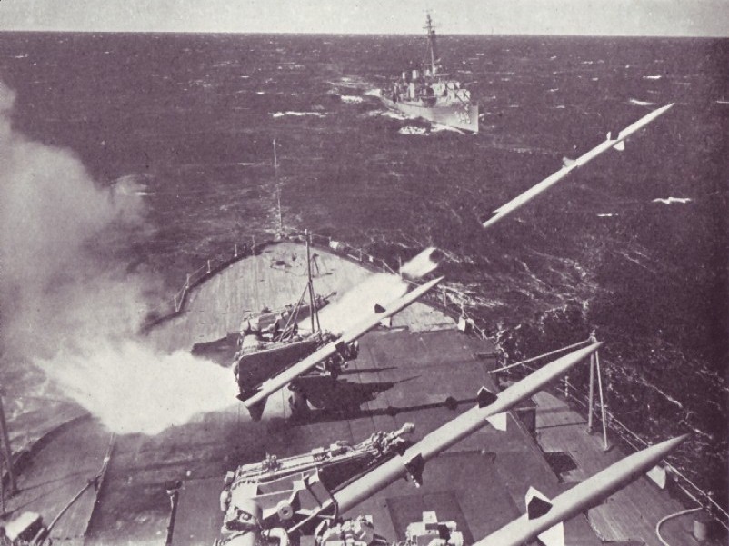 124k | Mid-1950s photograph of Kraus in the background while in the foreground the USS Mississippi (EAG-128, ex-BB-41) launches a Terrier guided missile. Photo from "Jane's Fighting Ships 1956-57". | Robert Hurst |