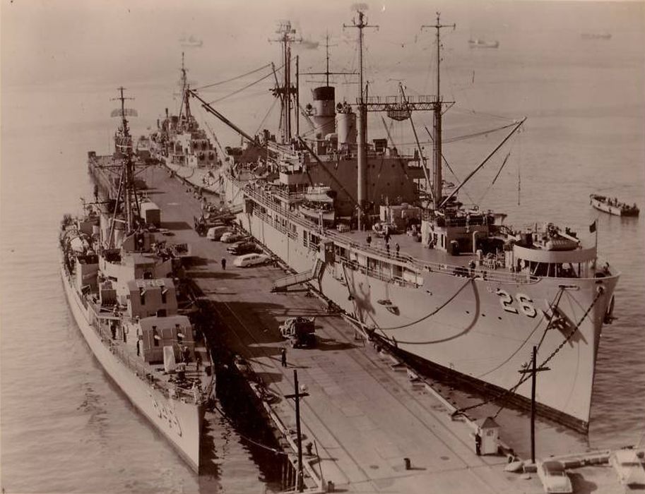 | 129k | USS Sierra (AD-18) at San Juan, Puerto Rico, 26 February 1967 with six destroyers alongside including the Basilone (DD-824), Fiske (DD-842), Davis (DD-937), Richard E Kraus (DD-849), Harwood (DD-861), and the Gyatt (DD-712). Taken from the USS Fred T. Berry (DD-858). | © Richard Leonhardt |