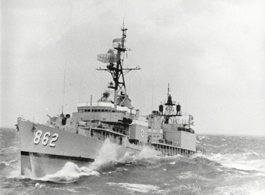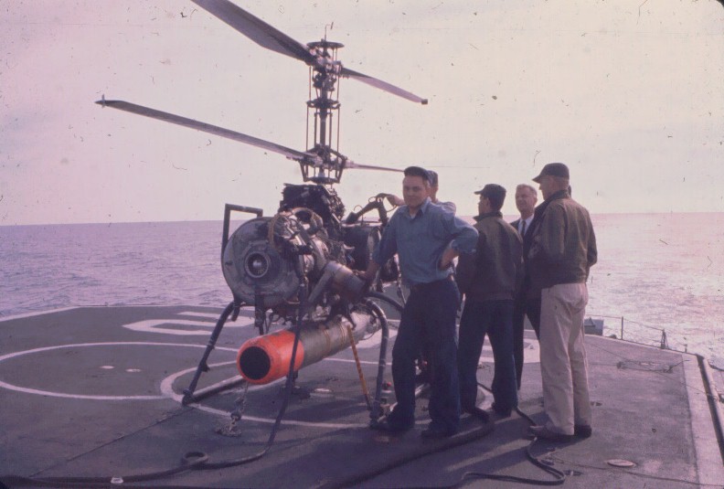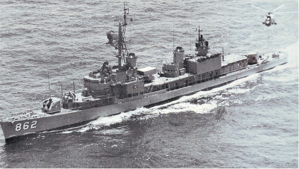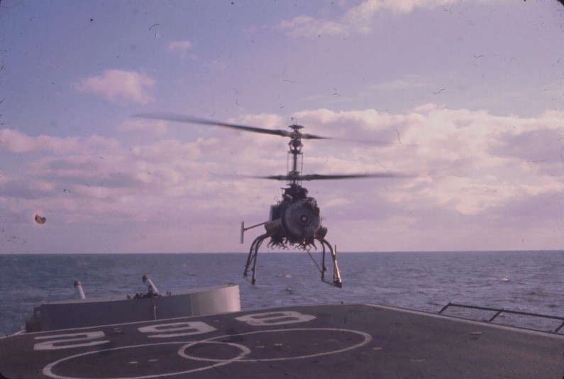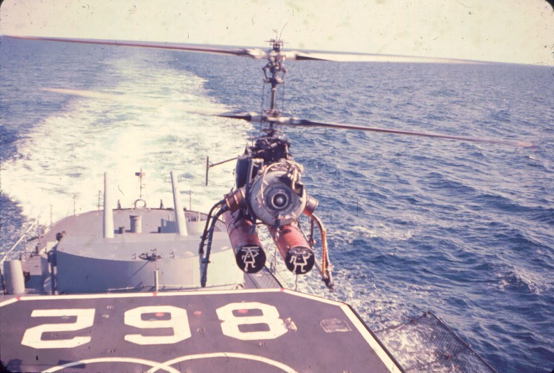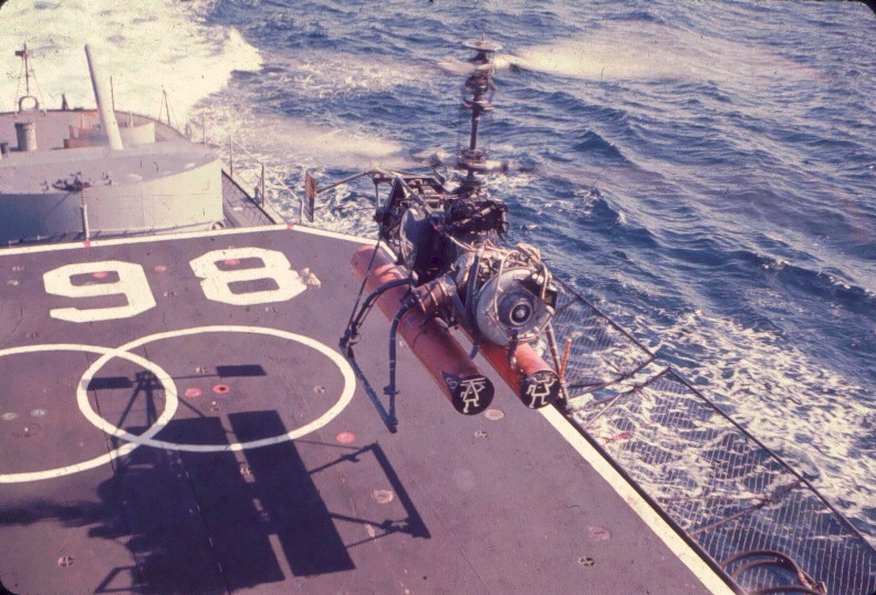 | 256k | USS Vogelgesang (DD-862) underway, location unknown. Note SH-3A Sea King with dipping sonar lowered hovering overhead. United States Navy, Official. | Robert Hurst |
