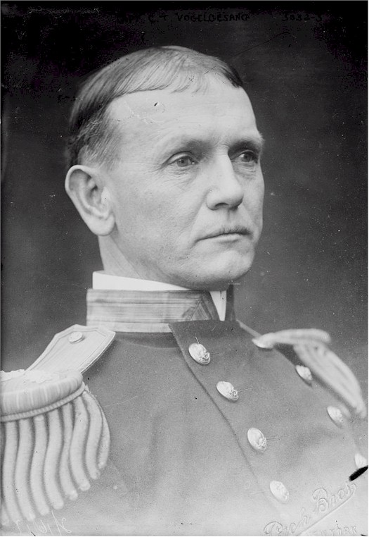 | 94k | Carl Theodore Vogelgesang was born on 11 January 1869 at North Branch, Calif. and was appointed a naval cadet (the name at that time applied to young men studying at the Naval Academy) on 6 September 1886. On 6 June 1890, he graduated from the Academy and began active duty on board Alliance as a passed naval cadet. At the completion of his requisite two years of sea duty before final graduation, he was commissioned an ensign on 14 July 1892 to date from 1 July 1892. Successive tours of duty on board Adams and Mohican occupied his time until 1895 when he was ordered to Washington, D.C., for duty in the Bureau of Navigation. Detached from that post on 29 August 1896, Ens. Vogelgesang reported to the gunboat Bancroft on 3 September. That ship remained his home through the Spanish-American War. Vogelgesang served in her during convoy escort missions and on blockade duty off Havana and near the Isle of Pines. Tours of duty in Celtic and at the New York Navy Yard in conjunction with the fitting out of Kentucky (Battleship No. 6) and Wisconsin (Battleship No. 9) followed. On 6 June 1904, he returned to the Bureau of Navigation for a two-year tour of duty as navigator on board Louisiana (Battleship No. 19), during which he attained the rank of lieutenant commander on 1 July 1905. A fifteen-month assignment from June 1906 to September 1907 was followed by his first command, Mayflower. That tour of duty ended in March 1908 when he transferred to Wisconsin as navigator. In May 1909, Lt. Comdr. Vogelgesang reported for duty ashore once more, this time to study at the Naval War College at Newport, R.I. On 2 May 1911, near the end of his assignment at the war college, Vogelgesang was promoted to full commander. On 2 May 1912, he transferred to Wyoming (Battleship No. 32) to fit her out. When she was commissioned, he assumed duty as her executive officer. In late January 1914, Cpmdr. Vogelgesang was ordered to Des Moines (Cruiser No. 15) which he commanded until 23 October. On 21 November 1914, he reported for duty at the Naval War College and remained there until the beginning of 1917, when he became Chief of Staff to the Commander in Chief, Asiatic Fleet. Just after assuming the duties of that office, he received his promotion to captain, to date from 29 August 1916. In January 1918, Capt. Vogelgesang relinquished his position as Chief of Staff to the Commander in Chief Asiastic Fleet, and reported to Rio de Janeiro, Brazil, as senior officer of the American naval commission. On 9 January 1919, Capt. Vogelgesang took charge of the fitting out of Idaho (Battleship No. 42) at Camden, N.J., and assumed command of her when that battleship was placed in commission on 24 March 1919. He commanded Idaho until June 1920 when he became the Chief of Staff to the Commander in Chief, Atlantic Fleet. A year later, Capt. Vogelgesang became Commandant, 3d Naval District, at New York. That tour of duty lasted until November 1922 when he received orders to organize and lead the United States Naval Mission to Brazil. For the next two years, he and his staff joined their Brazilian counterparts in reorganizing the Brazilian Navy. During his two years in Brazil, he helped to strengthen the warm and enduring friendship between that nation and the United States. Early in that assignment, he was promoted to rear admiral, to date from 16 October 1922. Rear Admiral Vogelgesang completed his mission in South America in January 1925 and returned to the United States on 7 February. On 3 April, he broke his flag in New York (BB-34) and became Commander, Battleship Division 2 of the Scouting Fleet. In June 1926, he was detached from command of Battleship Division 2 and took command of the Light Cruiser Division, Scouting Fleet. That tour of duty was abbreviated when Rear Admiral Vogelgesang entered the Naval Hospital, Washington, D.C., for treatment of a kidney ailment. He died there on 16 February 1927. | Bill Gonyo |