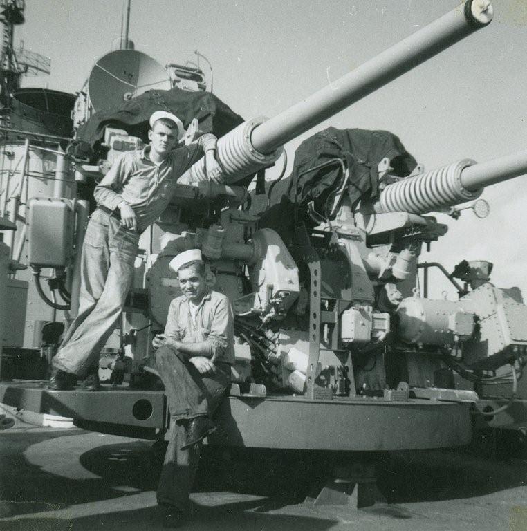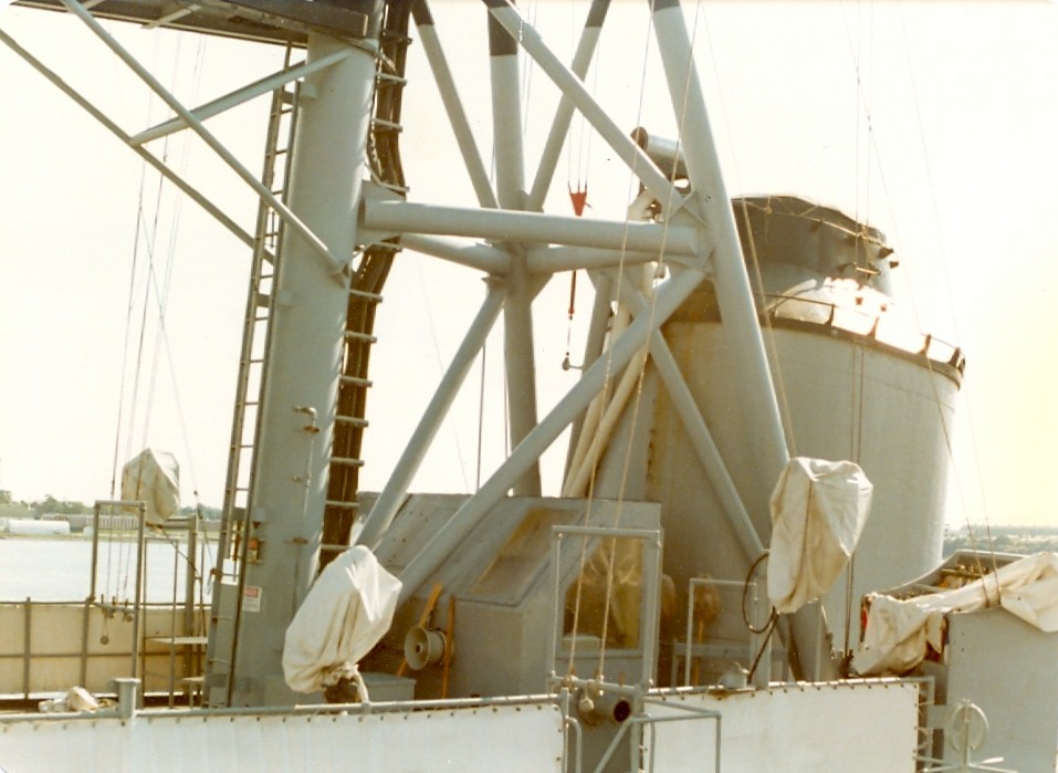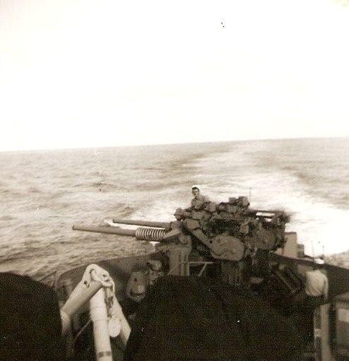 | 35k | Gunners working on Aft 3"/50 during March 1962 in the Atlantic. Note the refueling tripod is set up. | Robert King |