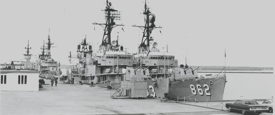 | 256k | Mist surrounds three docked destroyers. The destroyers are, from left to right: the USS Manley (DD-940), the USS Vogelgesang (DD-862) and the USS Edson (DD-946), April 1 1982. Photo courtesy of the National Archives. | Bill Gonyo |