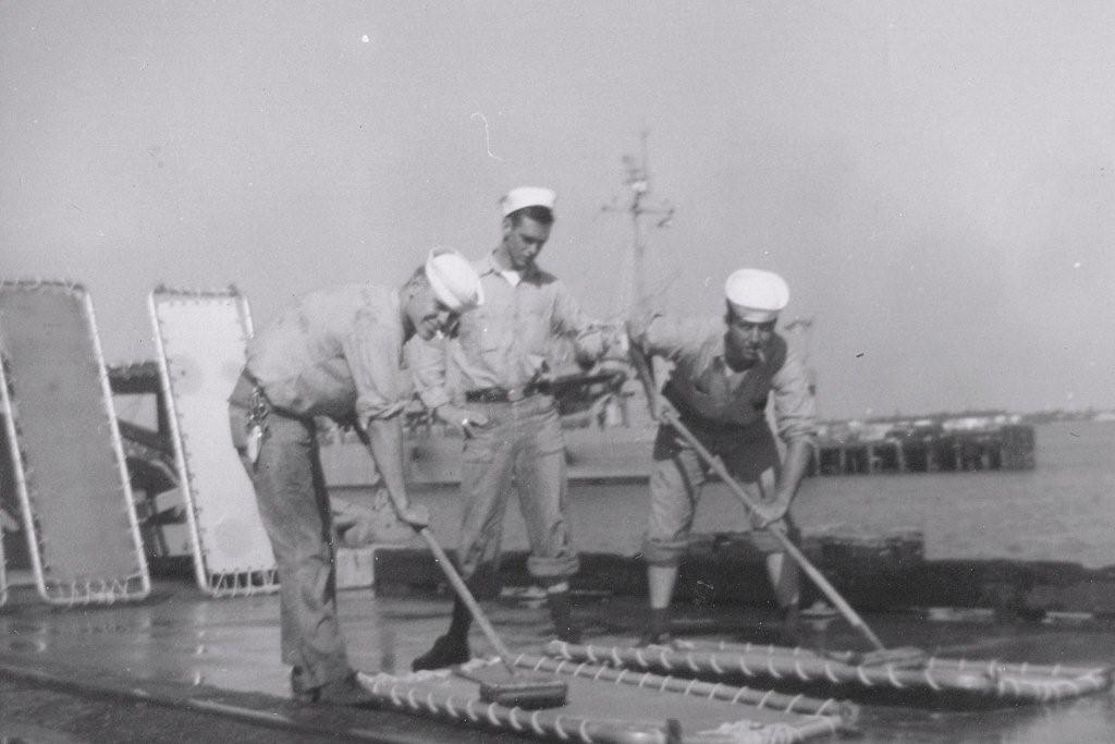 | 47k | Deck hands, Seaman Chuck Baade, Maurice Lamore and Paul Resnick, scrubbing mattress racks at Charleston in Mid 1961. | Robert King |