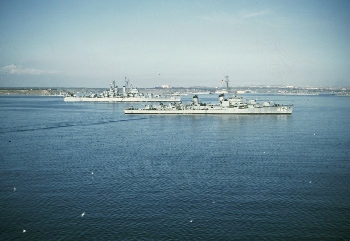 | 78k | USS Midway (CVB-41) during a deployment to the Mediterranean Sea from 29 October 1947 to 11 March 1948 anchored at Augusta Bay, Sicily, Italy. Nearest to the camera is the Gearing-class destroyer USS Vogelgesang (DD-862) with a Cleveland-class light cruisers visible behind, either USS Manchester (CL-83) or USS Providence (CL-82). Photo by Charles J. Beggy, Jr., ET2, USN (ret.) from USS Midway website. | Robert Hurst |