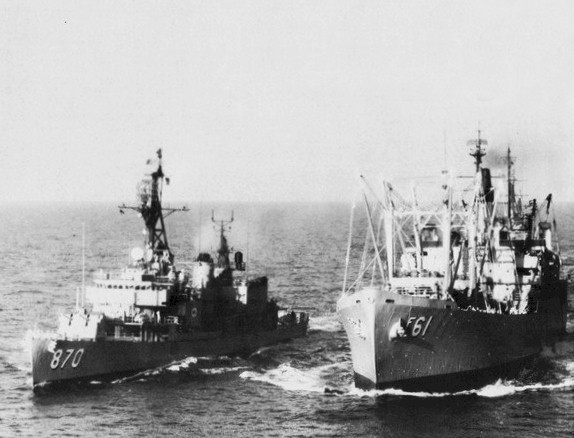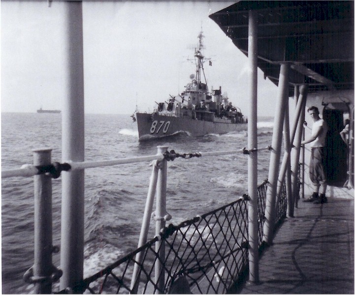 | 59k | USS Procyon (AF-61) replenishes the destroyer USS Fechteler (DD-870) off Vietnam in 1969. U.S. Navy photo from the USS Ticonderoga (CVA-14) 1969 cruise book. | Robert Hurst |