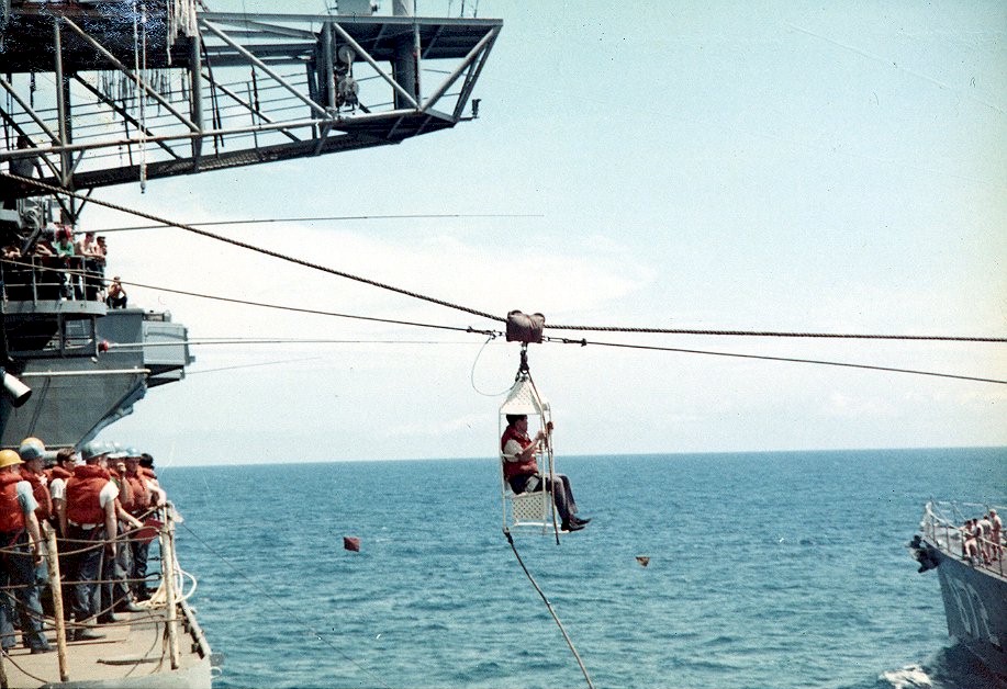 | 202k | View of Forrest Royal during a high line personnel transfer to the USS Hancock (CVA-19) in April of 1967, off the coast of Vietnam. | Charles Dehnert |