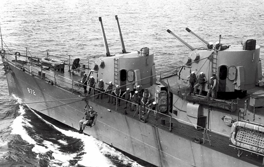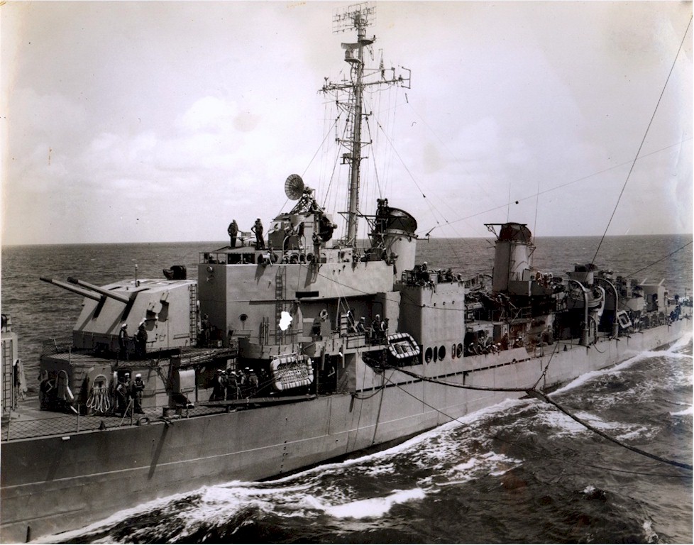 | 204k | USS Forrest Royal (DD-872) being refueled by the USS Cabot (CVL-28) sometime between 1949-1952 when the Cabot was serving as a training carrier at Pensacola, Florida. US Navy and Marine Corps Museum/Naval Aviation Museum, Photo No. 1991.291010. | Mike Green |