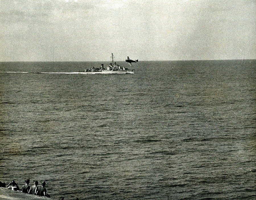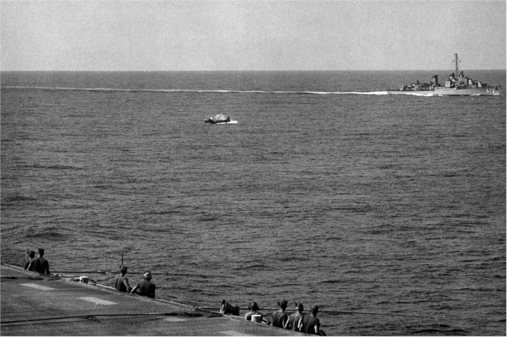 | 322k | With the USS Forrest Royal (DD-872) in the background, An SNJ-SC Texan crashes during 1953 carrier qualifications aboard the USS Monterrey (CVL-26). US Navy and Marine Corps Museum/Naval Aviation Museum, Photo No. 1996.488.014.005. | Mike Green |