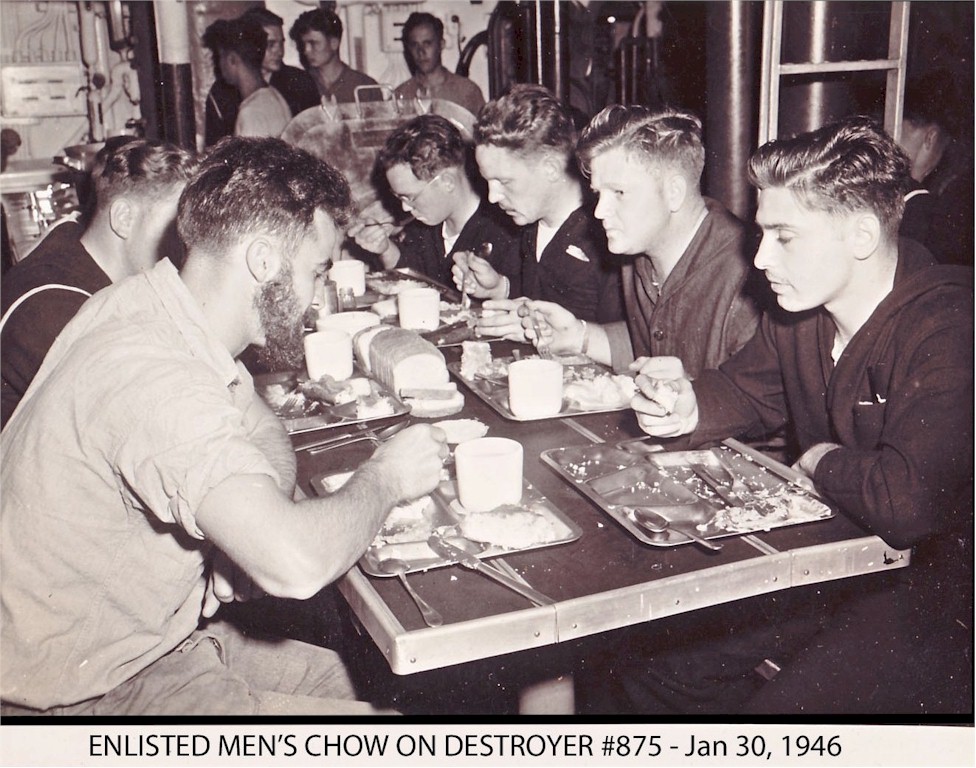 | 203k | View of enlisted men seated for chow on board the destroyer USS Henry W. Tucker (DD-875), January 30 1946. Item is part of a scrapbook that details the wartime service of Rear Admiral John Dale Price. Photo courtesy of the National Naval Aviation Museum. | Bill Gonyo | |