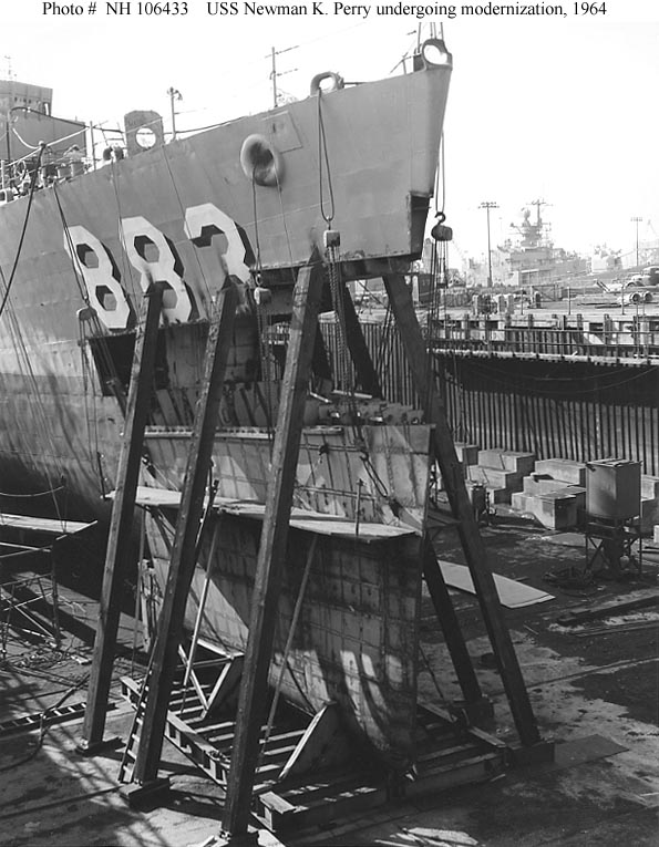| 97k | Photo #: NH 106433. USS Newman K. Perry (DD-883) receives a new lower bow, while undergoing her FRAM I modernization at the Boston Naval Shipyard, Charlestown, Massachusetts, 8 October 1964. Photographed by Nicola Mette. Official U.S. Navy Photograph, from the collections of the Naval History and Heritage Command. | Tony Cowart |