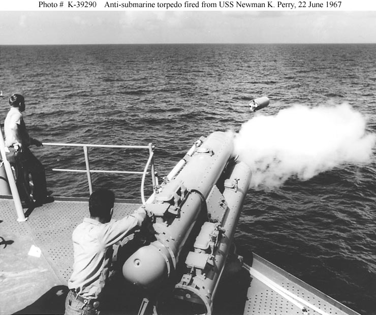 | 92k | Photo #: K-39290. USS Newman K. Perry (DD-883) crew members fire an anti-submarine torpedo from a Mark 32 triple torpedo tube mounting, 22 June 1967. Official U.S. Navy Photograph. | Tony Cowart |