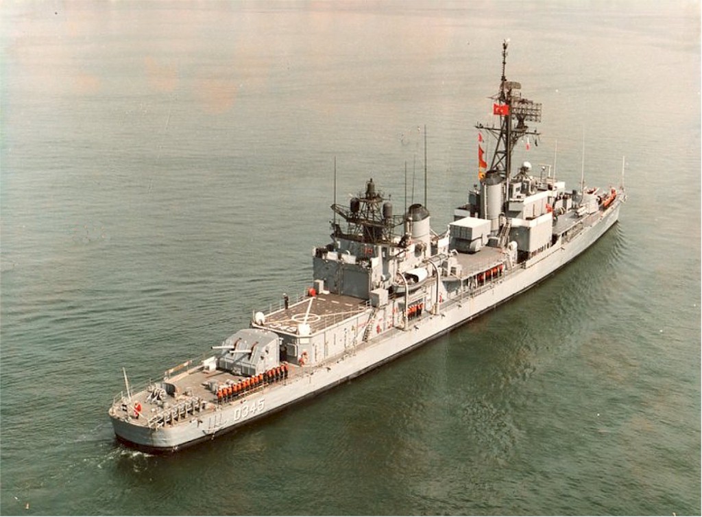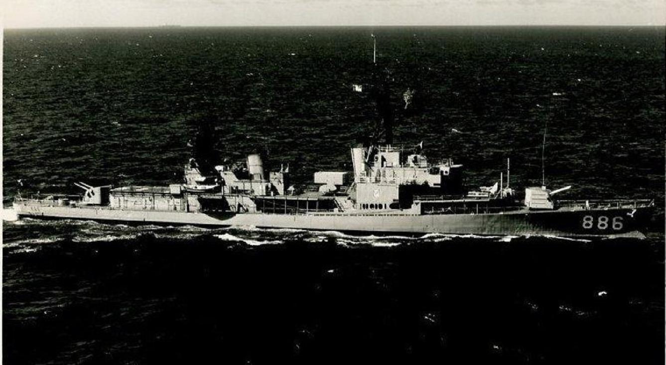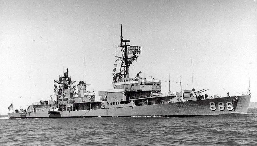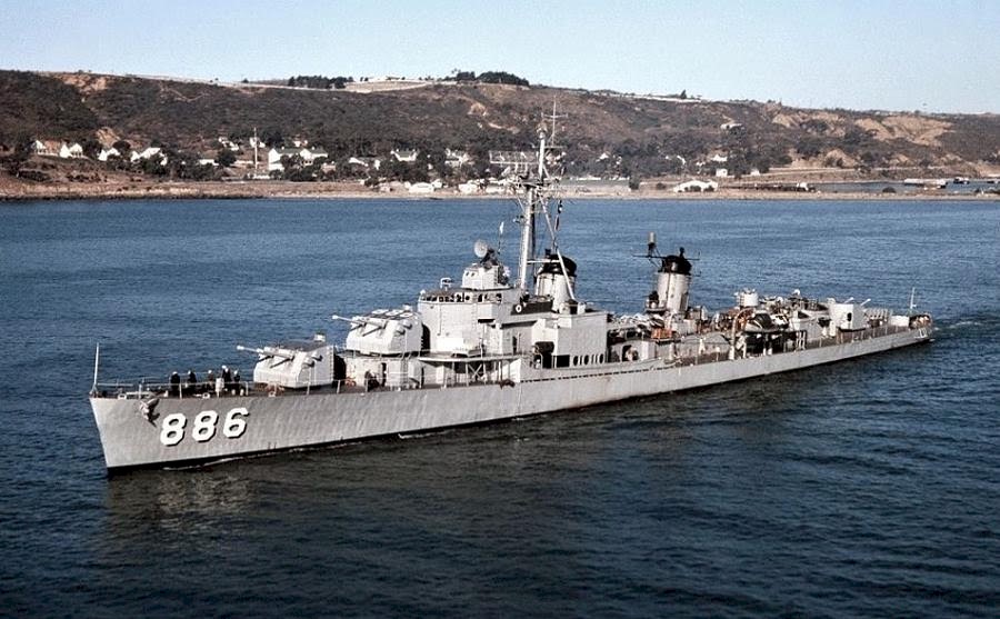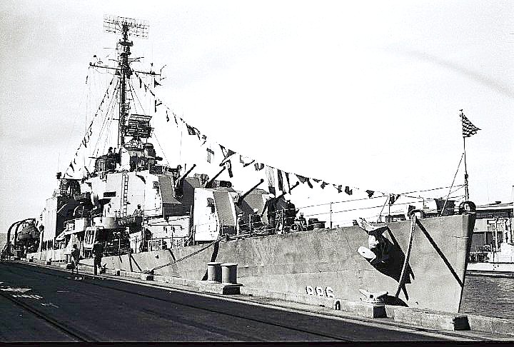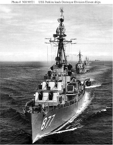 | 109k | USS Perkins (DDR-877) leading other ships of Destroyer Division Eleven, Pacific Fleet, circa 1954-1955. The next ship astern is USS Orleck (DD-886). Naval History & Heritage Command photo NH 99521 | Fred Weiss |