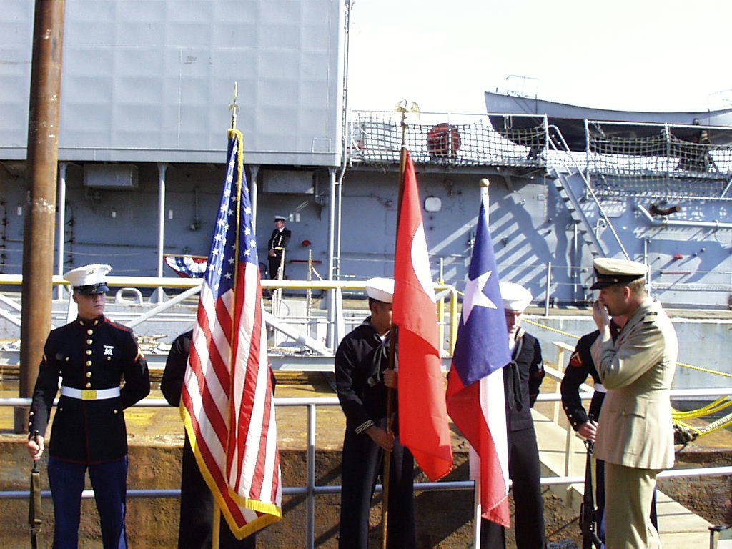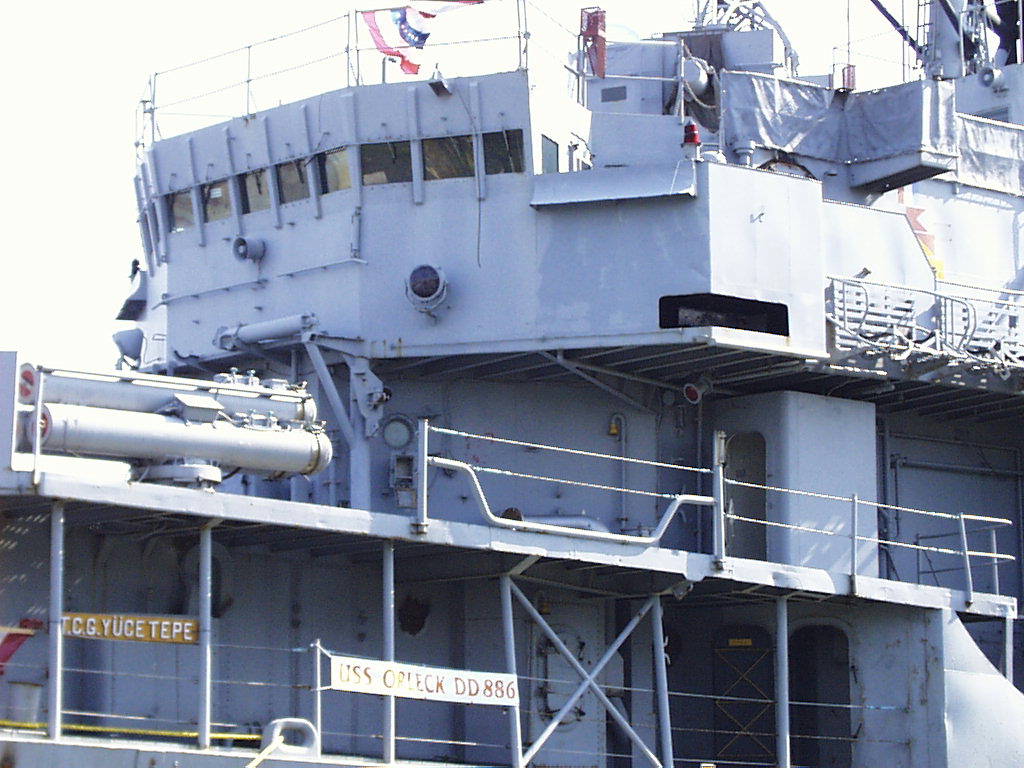 | 134k | The following 5 pictures are from Orleck's Arrival and Return Home ceremony held 12 August 2000 in Orange, Texas, across from where her keel was laid on November 24, 1944 at Consolidated Steel Shipyard. This shot is of the bridge area. | Bill Nicholas |