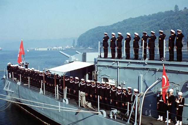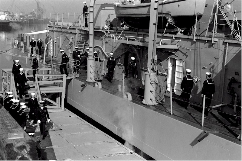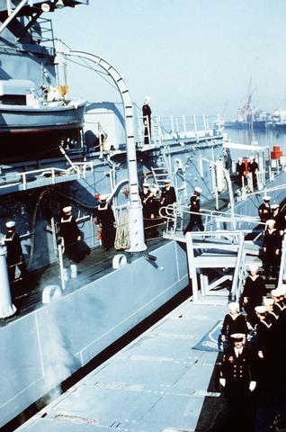 | 141k | Crew members of the destroyer USS Orleck (DD 886) disembark from their ship for the last time during the combined decommissioning and transfer ceremony at Tacoma, WA, 01 October 1982. After decommissioning, the ship will be transferred to the Turkish Navy and renamed the TCG Yücetepe (D 345). The Orleck was the last World War II era destroyer in the Pacific Fleet. DoD photo DN-SN-84-01185 | Bill Gonyo |
