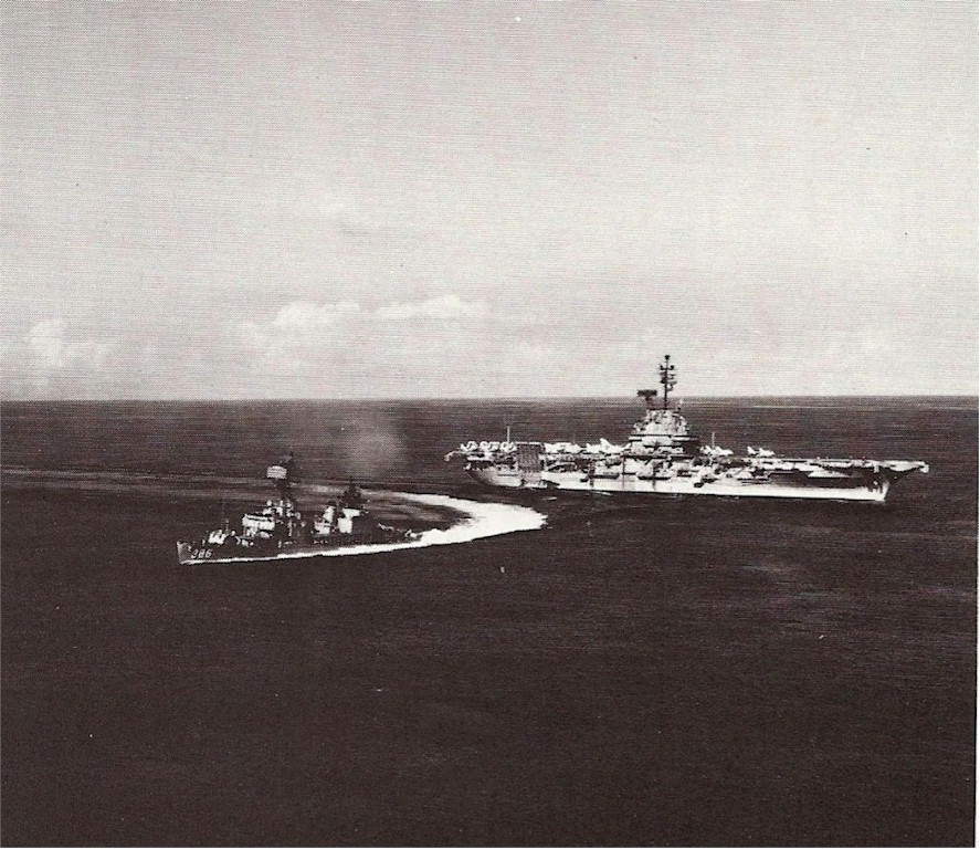 | 96k | USS Orleck (DD-886) steaming near the aircraft carrier USS Shangri-La (CVA-38), circa 1956. Shangri-La, with assigned Air Task Group 3 (ATG-3), was deployed to the Western Pacific from 05 January to 23 June 1956. US Navy photo from the USS Shangri-La (CVA-38) 1956 cruise book. | Robert Hurst |