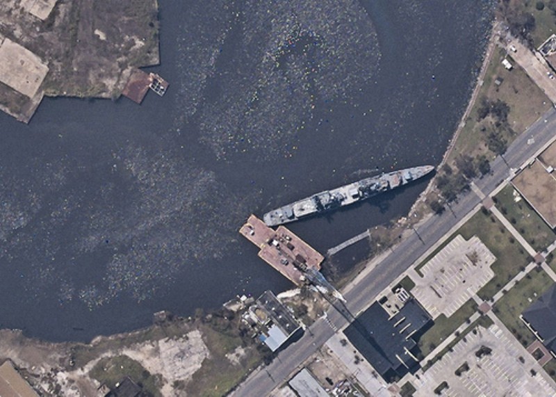 | 129k | USS Orleck (DD-886) as museum ship aground after Hurricane Rita at Orange, Texas on 05 October 2005. After decommissioning Orleck was transferred to Turkey in 1987. On 12 August 2000, the Turkish government transferred the destroyer to the Southeast Texas War Memorial and Heritage Foundation at Orange, Texas, for use as a memorial and museum under her old name, USS Orleck. When Hurricane Rita stuck the Texas coast in September 2005, Orleck was severely damaged. After repairs, Orleck was ready to return to her pier at Ochiltree-Inman Park; however, the City of Orange refused to allow her to return. Orleck was temporarily relocated to Levingston Island, but is now moored north of Orange Harbor Island at 30° 5'25.10"N 93°43'57.74"W. | Robert Hurst |